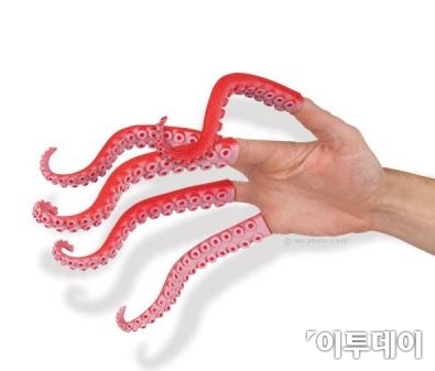 사진 속 모델은 다섯 손가락에 문어 다리를 끼우고 있다.