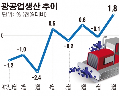 8월 제조업생산은 기계장비(-4.7%), 기타운송장비(-5.5%) 등에서 감소했지만 자동차(18.9%), 영상음향통신(11.1%) 등에서 늘어 전달보다 1.8% 증가했다. 지난해와 같은 달과 비교해서도 자동차(34.0%), 반도체 및 부품(10.0%) 등이 큰 폭으로 늘면서 3.4% 올랐다. 자동차 증가세가 큰 폭으로 오른 이유는 지난해 자동차 파업에 따른 기저효과의 영향인 것으로 전문가들은 분석했다.