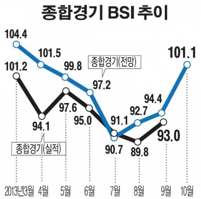 전국경제인연합회가 600대 기업을 조사한 결과 10월 전망치는 101.1를 기록했다.