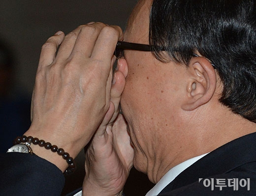 채동욱 검찰총장이 30일 오전 서울 서초구 대검찰청에서 열린 제 39대 검찰총장 퇴임식에서 동영상 시청 중 눈물을 닦고 있다. 방인권 기자 bink7119@