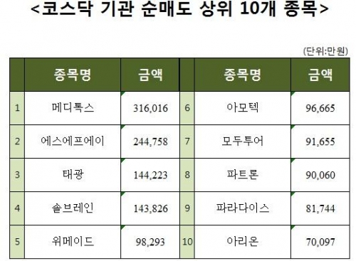 [코스닥 기관 순매도 상위 10개 종목]