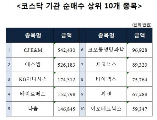 [코스닥 기관 순매수 상위 10개 종목]