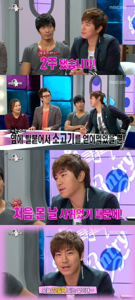 이에 MC들은 "방송이 나갈 때쯤이면 여자친구와 22일이 됐을 텐데 영상 편지를 보내라"고 부추겼다. 이를 들은 김정태는 "22일이면 결혼 얘기 나오겠다"고 너스레를 떨었다.