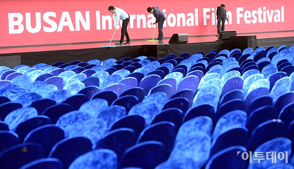 ‘제18회 부산국제영화제(BIFF)’ 개막일인 3일 오후 부산 해운대구 우동 영화의 전당에서 관계자들이 막바지 준비로 분주하다.