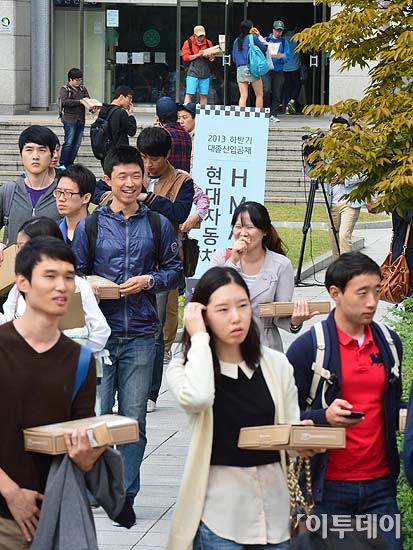 현대자동차 하반기 대졸 신입공채를 위한 현대차 인적성시험이 6일 서울 광진구 화양동 건국대학교에서 열렸다. 이날 인적성시험을 치른 취업준비생들이 고사장을 나오고 있다. 방인권 기자 bink7119@