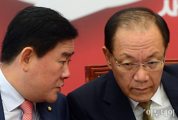 황우여 새누리당 대표와 최경환 원내대표가 7일 오전 여의도 국회 대표 최고위원실에서 열린 최고위원회의에 참석해 모두발언을 하고 있다. 노진환 기자 myfixer@