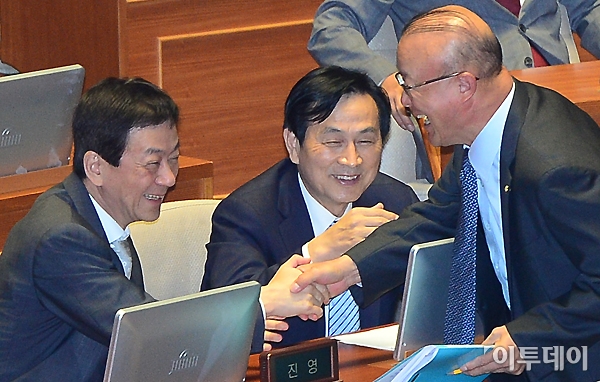 보건복지부 장관에서 사퇴한 진영 새누리당 의원이 7일 오전 의도 국회에서 열린 320회 국회(정기회) 5차 본회의에 참석해 동료 의원과 인사를 나누고 있다. 노진환 기자 myfixer@
