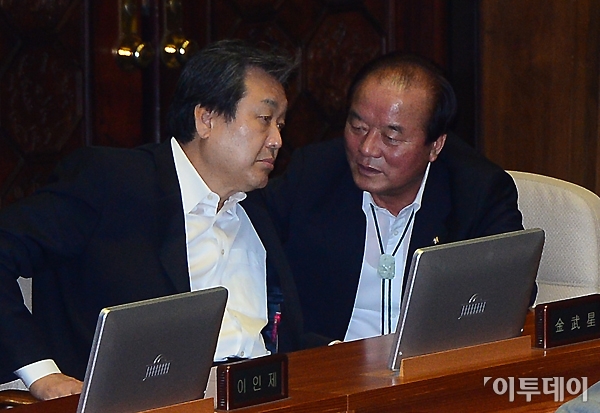 김무성 새누리당 의원이 7일 오전 여의도 국회에서 열린 320회 국회(정기회) 5차 본회의에 참석해 동료 의원과 이야기를 나누고 있다. 노진환 기자 myfixer@