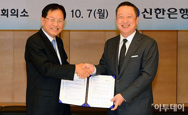 대한상공회의소와 신한은행이 중소기업 글로벌화를 위해 손을 맞잡았다. 박용만 대한상공회의소 회장과 서진원 신한은행장이 7일 오후 남대문로 대한상공회의소에서 ‘중소기업 글로벌화 지원을 위한 업무협약’을 체결한 후 악수를 하고 있다. 노진환 기자 myfixer@