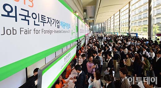 ‘2013 외국인투자기업채용박람회’가 10일 서울 강남구 삼성동 코엑스에서 개막됐다. 이날 박람회가 구직자들로 붐비고 있다. 올해로 8회째를 맞는 외국인투자기업채용박람회는 지멘스, 네슬레, 코스트코, 보쉬, 구글, 3M, 마이크로소프트 등 글로벌 500대 기업 32개사등 110대 외투기업이 참가했다. 이들 기업은 이번 행사에서 신입·경력사원으로 총 1천 400여명을 채용할 계획이다. 방인권 기자 bink7119@