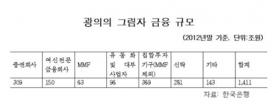 우리나라 그림자금융(섀도 뱅킹) 규모가 지난해 말 현재 1411조원으로 전년보다 11% 이상 증가한 것으로 나타났다. 특히 다른 주요국들과 달리 가파른 오름세를 나타내고 있다는 우려가 나오고 있다.