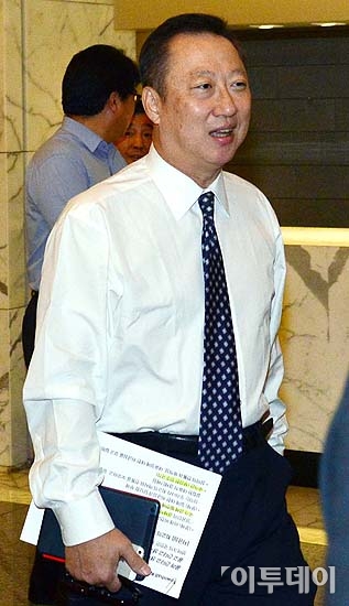 박용만 대한상공회의소 회장(두산그룹 회장)이 14일 오전 서울 중구 세종대로 대한상공회의소에서 취임 후 첫 열린 임직원 타운홀 미팅에 입장하고 있다. 방인권 기자 bink7119@