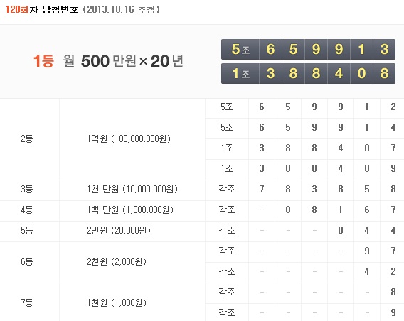 3등은 각조 783858번, 4등은 각조 끝자리 08167번이다. 5등은 각조 끝자리 044번, 6등은 각조 끝자리 42번, 97번이다. 7등은 각조 끝자리 8번, 9번이다.