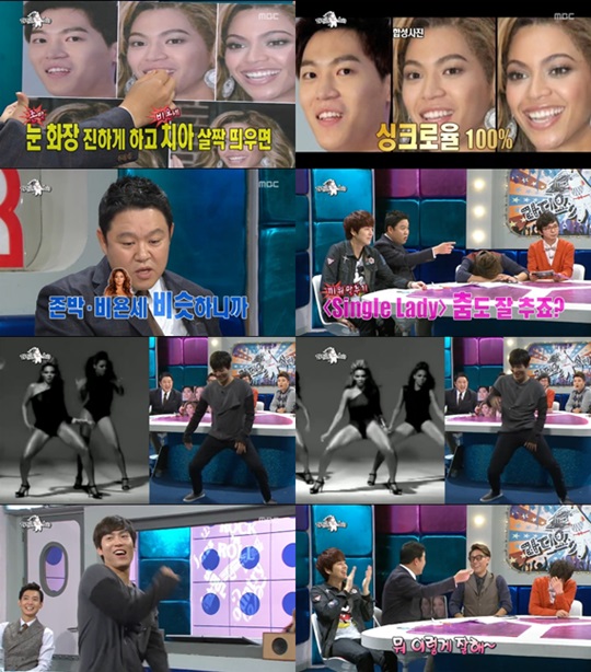 MC들은 "화장만 진하게하면 정말 똑같다"며 존박의 외모에 놀라움을 감추지 못했다. 이어 김구라는 "비욘세와 닮았으면 '싱글레이디' 춤도 잘 추냐"며 분위기를 띄웠다.