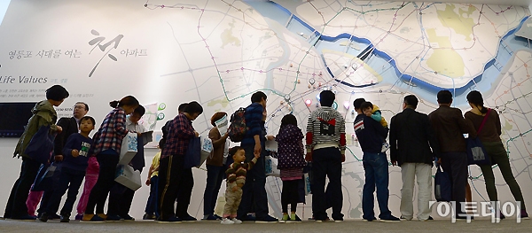 삼성물산이 신길뉴타운 11구역을 재개발해 선보인 ‘래미안 영등포 프레비뉴’ 모델하우스를 찾은 시민들이 20일 오후 신길동 모델하우스에서 긴 줄을 서서 기다리고 있다. 노진환 기자 myfixer@
