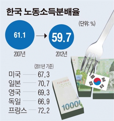 22일 한국은행에 따르면 국민소득에서 노동소득이 차지하는 비율을 나타내는 노동소득분배율은 2007년 61.1%에서 2012년 59.7%로 감소했다. 2000년 이후를 보면 초반에는 늘어나기 시작했으나 2006년에 61.3%로 정점을 찍고, 2007년(61.1%), 2008년(61.0%), 2009년(60.9%), 2010년(58.9%) 감소했다. 다만 2011년(59.5%), 2012년(59.7%)에는 소폭 늘었다.