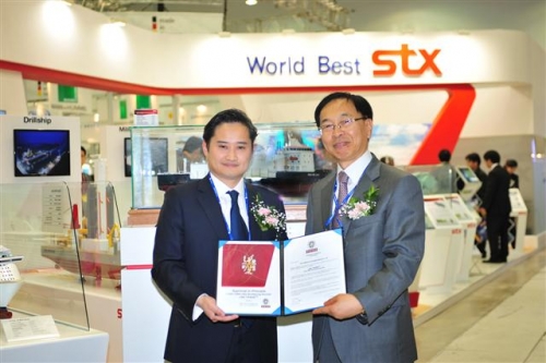 ▲STX조선해양이 개발한 LNG벙커링 셔틀이 세계 최초로 프랑스 선급 BV사로부터 AIP인증을 획득했다. 휜덕덩 BV선급 한국지사장(왼쪽)과 황병현 STX조선해양 영업·기획부문장(오른쪽).