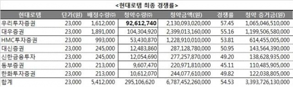 23일 상장주관사인 우리투자증권과 KDB대우증권에 따르면 현대로템 일반 투자에게 배정된 541만 2000주에 약 2억9500만주가 몰렸으며 청약증거금으로 약 3조3937억2600만원이 들어왔다. 청약경쟁률만 54.53대 1에 달한다.