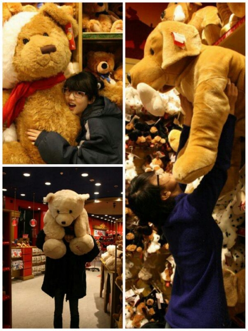 이 사진에서 은지는 곰돌이 푸와 강아지, 곰 인형에 안겨 있거나 인형을 들고 있다.