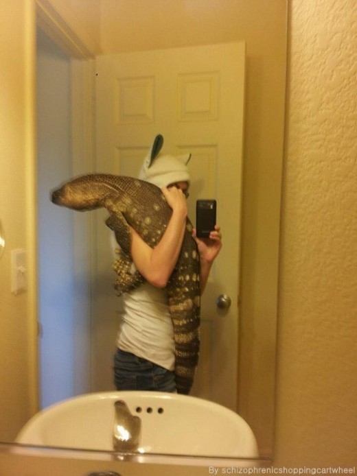 해당 사진 속에는 한 사람이 도마뱀을 안고 욕실에 서 있는 모습이 담겨 있다. 이 도마뱀은 얌전하게 주인 품안에 안겨 있으나 거대한 크기와 거친 피부로 섬뜩한 느낌을 자아내고 있다.