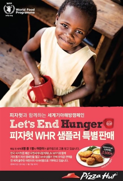 한국 피자헛은 전 세계 굶주림으로 고통 받고 있는 기아를 위한 ‘WHR 샘플러’를 마련하고 판매 수익금 전액을 기부한다. 2007년부터 매년 10월에 진행하는 세계기아해방(WHR) 캠페인의 일환으로, 캠페인 기간 동안 WHR 샘플러를 주문하면 수익금 전액이 유엔세계식량계획(WFP)을 통해 기아를 위한 영양죽 마련 기금으로 사용된다.