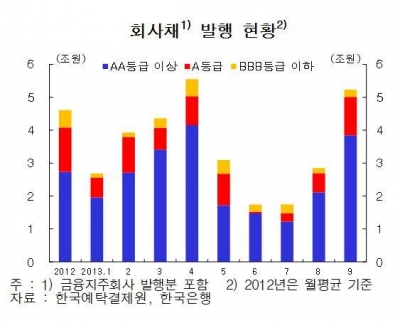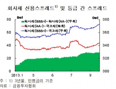 한국은행이 31일 국회에 제출한 ‘금융안정보고서’에 따르면 지난 5월 이후 STX그룹 부실, 미 연준의 양적완화 축소 관련 불확실성, 동양그룹의 유동성 위기 등의 영향으로 비우량 기업을 중심으로 회사채시장을 통한 자금조달 여건이 악화되고 있다.