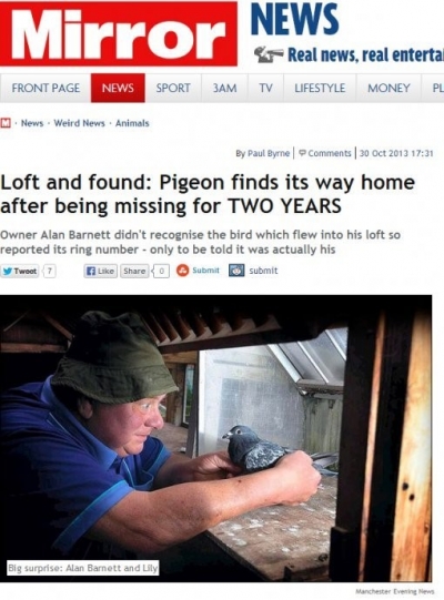 영국 체셔 주 스톡포트에 거주하는 알란 바넷은 2년 전 자신이 기르던 비둘기 릴리가 집으로 돌아와 놀라워 했다. 자신이 잃어버린 비둘기를 알아보지 못했던 주인은 영국 왕실 비둘기 경주 협회에 비둘기에 채워져 있던 링에 새겨진 고유 번호를 문의했다. 협회 측은 알란의 비둘기가 맞다고 답했다.