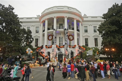 버락 오바마(가운데) 미국 대통령이 지난달 31일(현지시간) 핼러윈데이를 맞아 백악관에서 지역 군인 가족들을 초대해 아이들에게 사탕을 나눠주고 있다. 미국 연례 풍속행사인 핼러윈에는 아이들이 마녀 괴물 해적 등의 분장을 하고 이웃을 방문해 초콜릿이나 사탕을 받는 것이 전통이다. 워싱턴D.C/AP연합뉴스