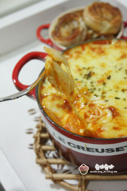 잘 볶아진 양념장에 물 400ml를 넣고 중불에 맞춰 떡과 어묵을 넣은 뒤 소스를 잘 졸인다. 불을 약한 불로 맞추고 양파오 양배추 등을 넣어 계속 졸여준다. 마지막으로 소스가 적당량이 될 때 버터 조금과 피자치즈를 원한느 양만큼 넣어주면 완성된다.