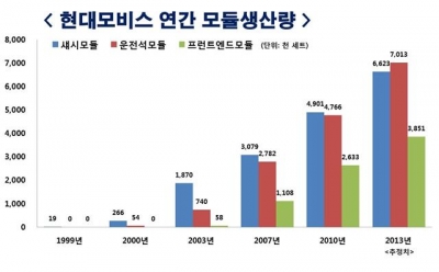 현대모비스는 1999년 현대차 트라제 섀시 모듈을 시작으로 본격적으로 모듈 생산에 뛰어들었다. 이후 2000년엔 운전석 모듈, 2003년엔 프런트엔드 모듈을 생산하며 세계적인 모듈 업체로 성장했다. 특히 지난 2008년 3000만 세트를 누적 생산한 지 불과 5년 만에 1억 세트 생산을 돌파했다.