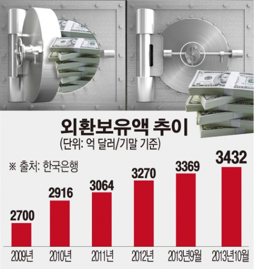 한국은행은 10월 말 현재 외환보유액이 전월대비 63억달러 증가한 3432억3000만 달러를 기록했다고 5일 밝혔다. 외환보유액은 지난 7월 3297억1000만달러로 역대 최고치를 기록한 이후 증가세를 이어가고 있다. 특히 10월 증가액(63억 달러)은 2011년 10월(75억9000만 달러) 이후 2년 만에 가장 큰 규모다.