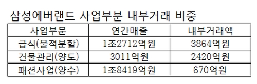 떼어내는 사업부분별 내부거래 비중을 보면 삼성웰스토리가 가져가는 급식사업부분은 1조2712억원 중 30%인 3864억원 가량이 내부거래다. 에스원이 가져가는 건물관리부분은 3011억원 중 80%인 2421억원이 계열사를 통해 올린 매출이다.