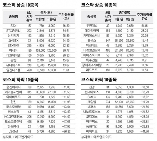 11월 첫째 주 기준 코스피 시장에서 주가 상승률이 가장 높았던 종목은 STX이며, 주가 하락률이 가장 높았던 종목은 JS전선으로 조사됐다. 이 순위는 시가총액 200억원 이상을 기준으로 뽑은 에프앤가이드의 자료에 의하며 관리종목, 동전주, 투자이상종목은 제외됐다.