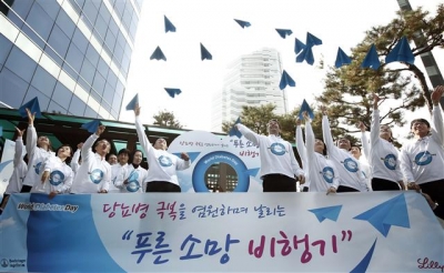 양사 임직원들은 파란색 종이 비행기에 당뇨병 극복에 대한 염원과 희망의 메시지를 적어, ‘세계 당뇨병의 날‘을 상징하는 푸른 원 안으로 함께 비행기를 날렸다.