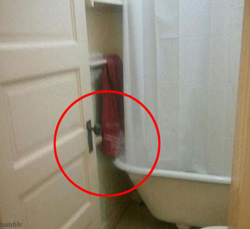 사진 속에는 욕조에 샤워 커튼이 쳐 있는 한 외국 아파트 욕실의 모습이 담겨있다. 그런데 샤워 커튼과 붉은색의 수건 사이에 마치 유령의 것처럼 보이는 희미한 모습의 손이 포착됐다.