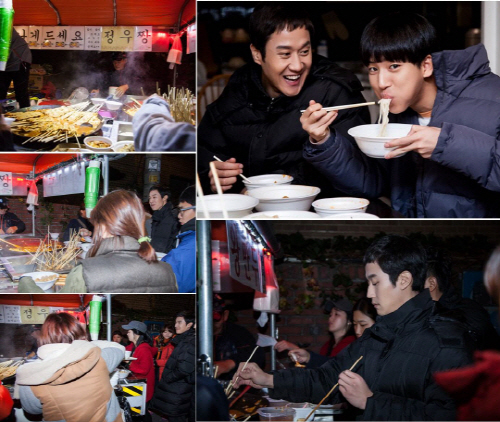 실제로 공개된 사진 속에서 정우는 현장 스태프들과 야식을 나눠먹으며 즐거운 모습을 보이고 있다.