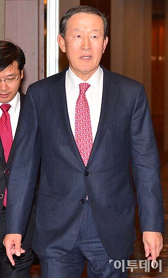 허창수 전국경제인연합회 회장이 14일 오후 서울 중구 소공동 롯데호텔에서 열린 11월 전경련 회장단 회의에 참석하고 있다. 올해 마지막 전경련 정기 회장단회의가 열렸지만 대내외적 악재와 개인 사정 등으로 이번에도 50% 안되는 초라한 출석률을 보였다. 방인권 기자 bink7119@