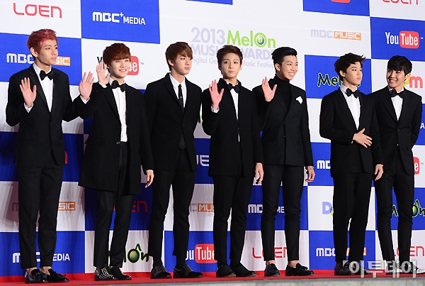 아이돌 그룹 방탄소년단이 14일 오후 서울 송파구 방이동 올림픽공원 체조경기장에서 열린 ‘2013 멜론 뮤직 어워드’에 참석해 취재진에게 포즈를 취하고 있다. 노진환 기자 myfixer@