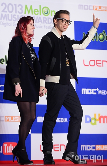 밴드 버스커버스커의 브래드와 그의 아내가 14일 오후 서울 송파구 방이동 올림픽공원 체조경기장에서 열린 ‘2013 멜론 뮤직 어워드’에 참석해 취재진에게 포즈를 취하고 있다. 노진환 기자 myfixer@