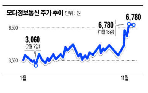 지난 9월3일 기준가 4500원에 무상증자에 따른 권리락을 실시한 모다정보통신은 18일까지 두 달 동안의 주가 상승률은 50%에 달한다.