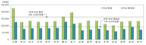 자산이 가장 많은 도시는 서울로 가구 당 평균 자산이 4억 5253만원이다. 이어 △경기 3억 9140만원 △울산 3억 3026만원 등의 순으로 많은 것으로 집계됐다.