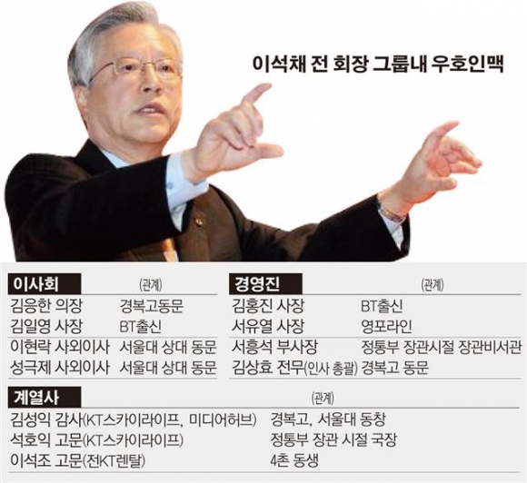 대선 당시 박근혜 후보 캠프에서 선대본부장을 지낸 홍사덕 민화협 상임의장(KT 경영고문), 공보단장을 지낸 김병호 전 의원(KT 경영고문), 김종인 전 경제민주화추진단장(KT 경영자문) 등 캠프 출신 인사가 대거 포함됐다. 또 국민행복기금 이사장을 겸임하고 있는 박병원 사외이사 등 현 정부 인사도 포진하고 있다. 이춘호 EBS 이사장(KT 사외이사) 등 이명박 정부 인사들도 요직을 지키고 있다. 오세훈 전 서울시장의 여동생인 오세현 신사업본부장과 전 MB정책특보를 지낸 임현규 부사장, 이 회장과 고교 대학 동기인 김성익 KT미디어허브 감사, 정보통신부 장관 시절 부하 직원으로 일했던 이성해·석호익 KT스카이라이프 고문 등도 이름을 올렸다.