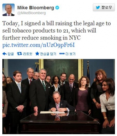 블룸버그 시장은 이날 오후 자신의 트위터에 “오늘 뉴욕시의 담배 구매 가능 연령을 21세로 높이는 법안에 서명했다”면서 “이는 뉴욕시의 흡연 인구를 줄이는 데 기여할 것”이라고 밝혔다.