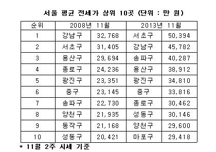 최근 5년새 서울을 포함한 수도권 전세 지형도가 크게 바뀐 것으로 나타났다. 전세 최고가 지역이던 강남구가 서초구에 밀려 2위로 추락했고, 목동 학군으로 전셋값이 비쌌던 양천구는 성동구에 밀렸다.