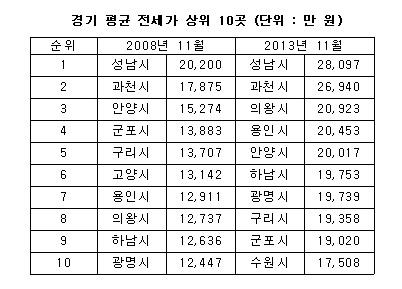 용인시도 같은기간 7위에서 4위로 올라섰다. 용인은 신분당선과 분당선 연장선이 2011년 연이어 개통하면서 서울 강남권 출퇴근이 쉬워져 전세 수요자들의 이동이 많았다. 하남시와 광명시도 9위와 10위에서 각각 6위와 7위로 수직상승했다. 2008년~2009년 입주한 아파트들의 재계약 등을 통해 전셋값 상승을 이끌어냈다.