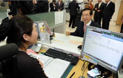 ▲박원순 서울시장(오른쪽)이 '서울시 지하철 9호선 특별자산 펀드' 판매 첫날인 20일 KB국민은행 무교지점을 찾아 은행 관계자들과 대화를 나누고 있다.(사진=서울시)