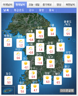 오전 현재 서울과 대전 기온 영하 1도, 춘천 영하 6도로 전날 같은 시각 대비 1~2도가량 낮다.