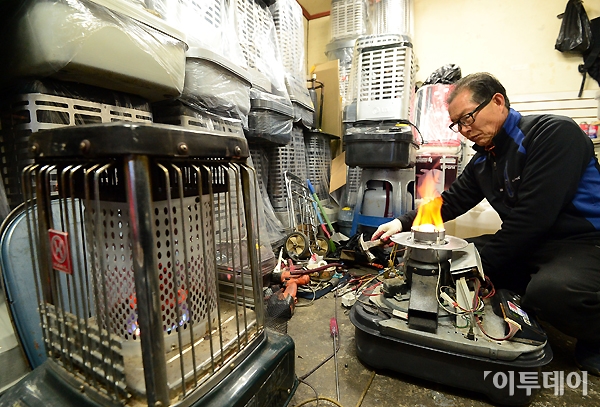 때 이른 추위에 전기장판, 난로 등 난방용품을 찾는 수요가 늘고 있다. 내일부터 전기요금이 평균 5.4% 인상된다는 소식에 석유난로는 인기상품이 됐다. 20일 오후 서울 중구 중앙시장에서 석유난로를 수리하는 상인의 손길이 분주하다. 노진환 기자 myfixer@