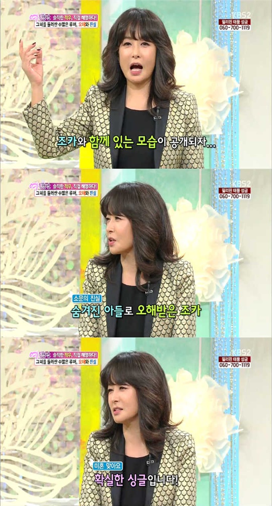 하지만 곧바로 “제 아이는 아니고 오빠의 아들이다. 조카를 너무 예뻐하다 보니 숨겨진 아들로 오해를 받았다”고 해명했다. 이어 “사실 조카가 너무 예뻐서 ‘내 아이였으면 좋겠다’고 생각한 적은 있다”며 "소문이 점점 무성해지면서 나도 모르는 무수히 많은 아버지가 거론되기도 했다. 근거 없는 루머로 가족들이 상처를 많이 받았다"고 말했다.