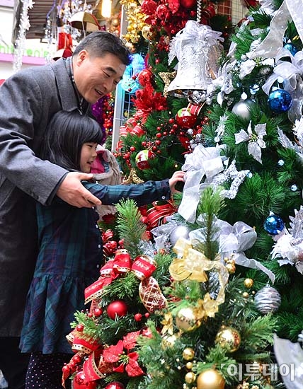크리스마스를 한 달여 앞둔 24일 오후 서울 중구 남대문시장을 찾은 한 가족이 크리스마스 트리를 살펴보고 있다. 방인권 기자 bink7119@